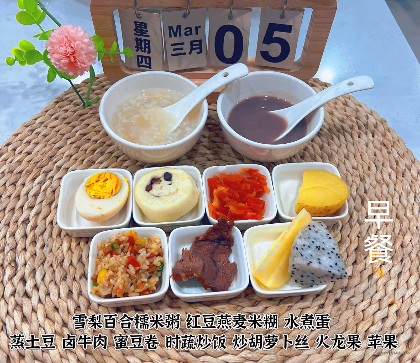 老师每天都会把当天的早、中、晚餐整理好发到群里,不只是简单拍一张照片,而是明显经过了认真摆放:餐盘整齐,菜品分区清楚,颜色搭配也很好,每一道菜还都会标注名称。看得出来,老师们在这些细节上确实花了不少心思。