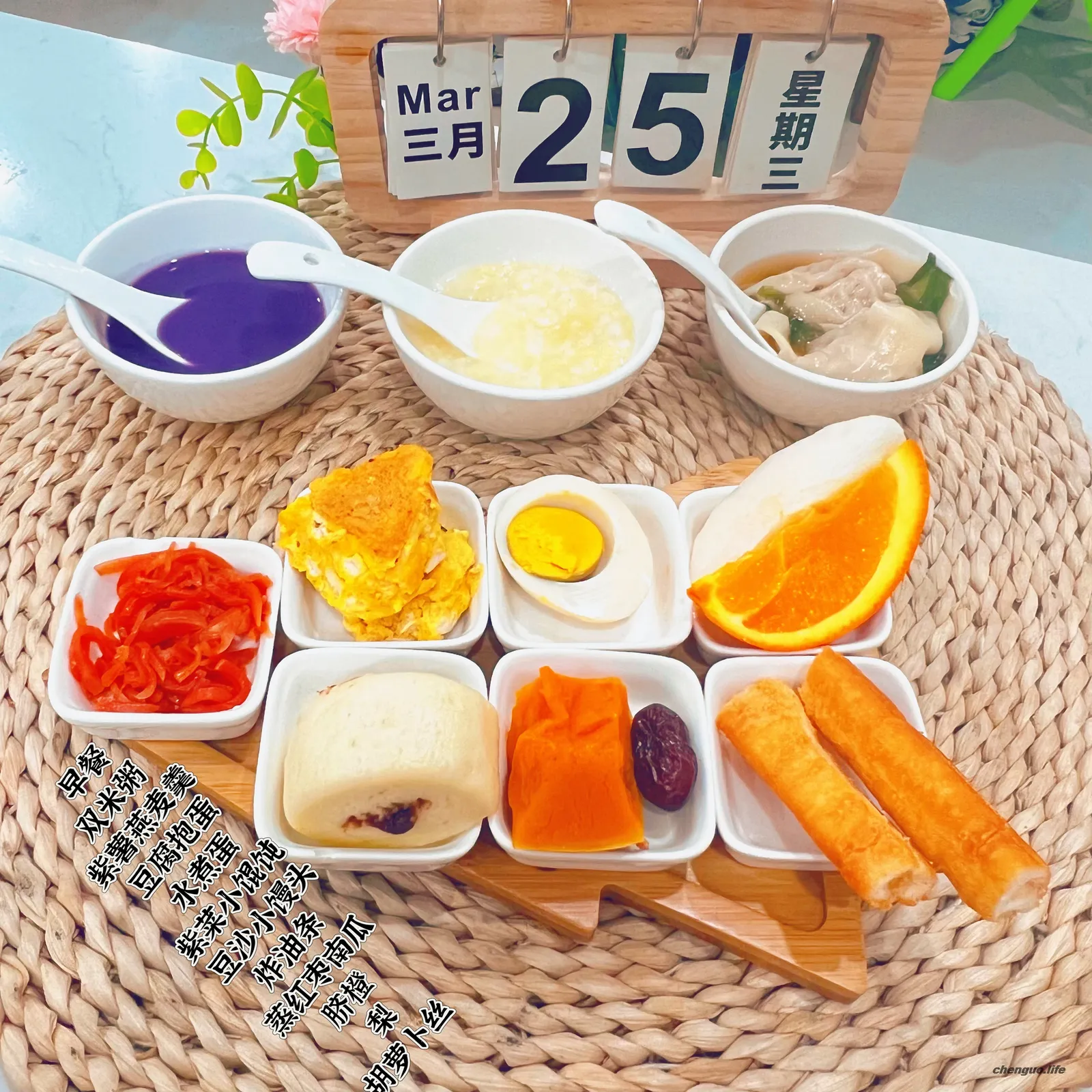 这两周我陆续把老师在班级群里分享的餐食照片整理了一下,准备记录在果果日记里。不得不说,幼儿园在饮食安排上还是挺用心的,尤其是早餐这一块,种类丰富、搭配多样,看着就很有食欲。